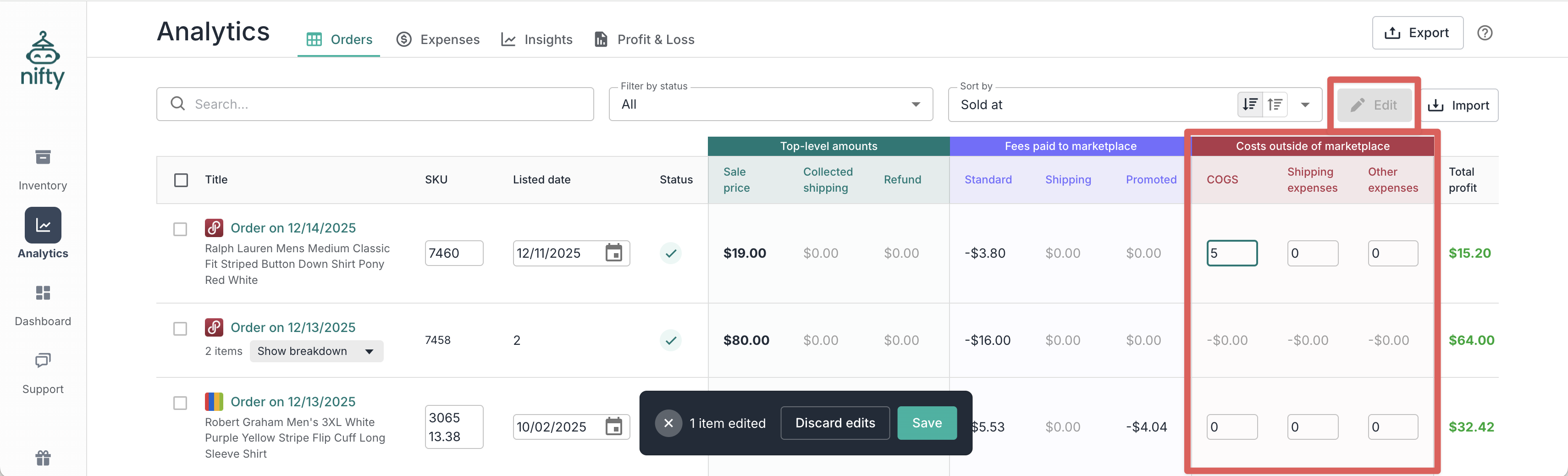The **Orders** table gives you a complete view of your sales across all marketplaces. Nifty automatically parses receipts to extract marketplace fees, shipping fees, and promoted fees — so you can track profits without manual data entry.