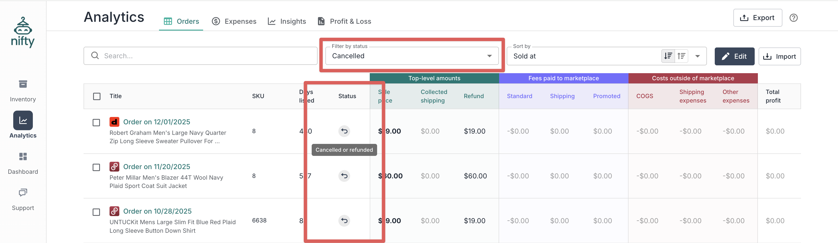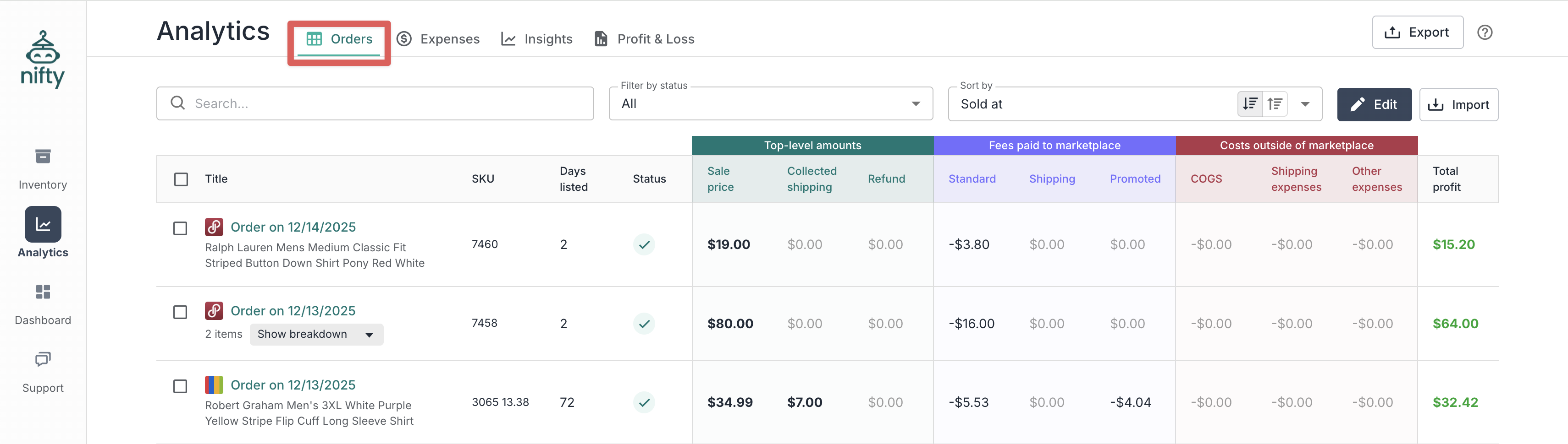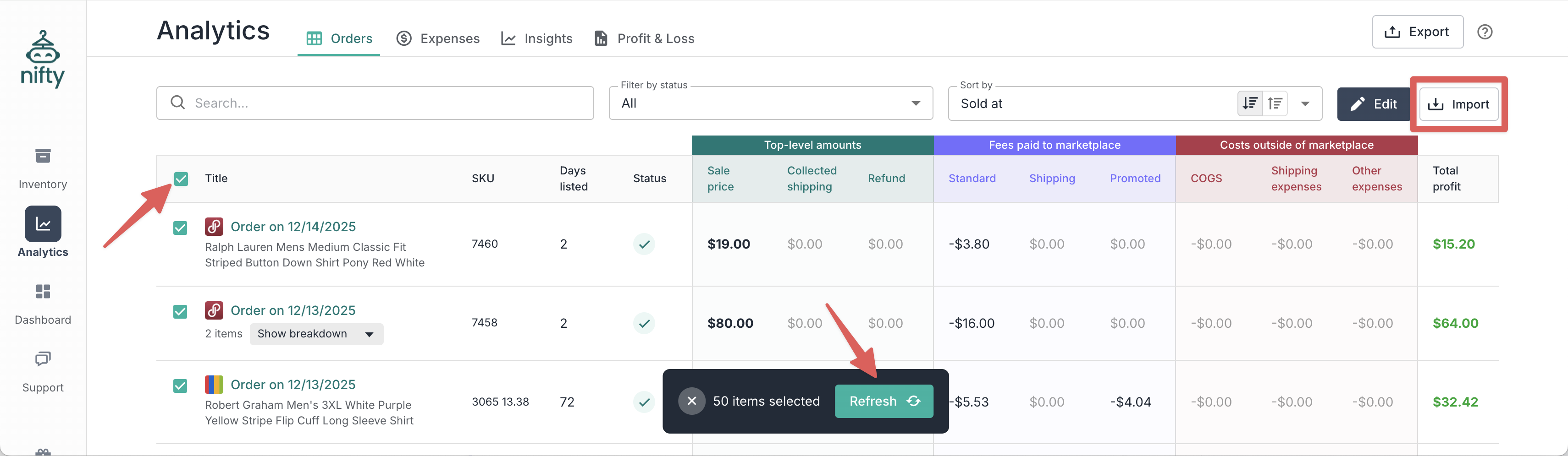 **Note:** After a sale is detected, Nifty will automatically try to bring it into your **Analytics** over the course of 72 hours. If it's not shipped by then, you'll need to **Import** it manually.