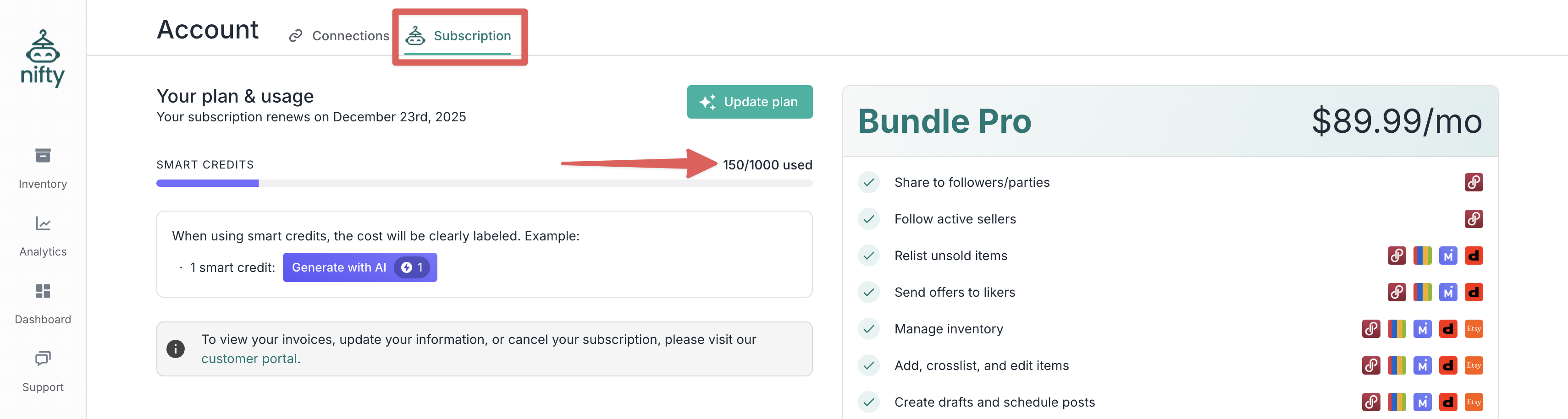 **Smart Credits** are Nifty's currency for AI-powered features. Your plan includes a monthly allocation, and certain actions consume credits.